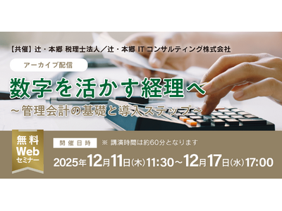 辻・本郷 税理士法人(本社:東京都新宿区、理事長:桑木小恵子)は、辻・本郷 ITコンサルティング株式会社(本社:東京都渋谷区、代表取締役社長:黒仁田健)と共催で、2025年12月11日(木)に「【アーカイブ配信】数字を活かす経理へ~管理会計の基礎と導入ステップ~」セミナーを開催いたします。リクエスト多数につき、8月にオンラインで開催したセミナーのアーカイブ配信です。
