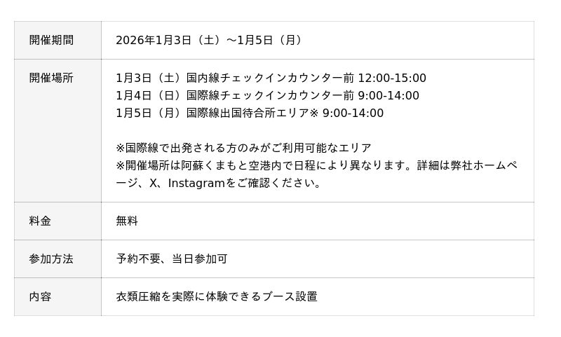 洋服などの衣類を “手のひらサイズ” に圧縮するサービスが体験できる実証実験を、阿蘇くまもと空港で2026年1月3日(土)から1月5日(月)まで開催