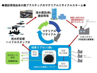 城東リプロン(株)(社⾧:横江政洋)は、清水建設(株)(本社:東京都中央区、社⾧:新村達也) と協業し、日本道路(株)(本社:東京都港区、社⾧:石井敏行)と伊藤忠プラスチックス(株)(本社:東京都千代田区、社⾧:林 英範)の協力を得て、清水建設(株)の建設現場で回収した廃プラスチックをプラスチック製雨水貯留槽(ハイドロスタッフ(R))の構造体にマテリアルリサイクルし、清水建設(株)の建設現場に戻す取り組みを開始したことをお知らせします。