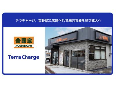 電気自動車(EV)向け充電サービス「Terra Charge(テラチャージ)」を展開するTerra Charge 株式会社(本社:東京都港区、代表取締役社長:徳重徹、以下、当社)は、株式会社吉野家(本社:東京都中央区、代表取締役社長:成瀬 哲也、以下、吉野家)が運営する全国にあるうちの21店舗へ、急速充電器を順次拡大してまいります。