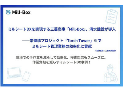 三菱商事株式会社マテリアルソリューショングループ産業素材DX部(以下、三菱商事)が提供するクラウド型ミルシート※電子管理システム「Mill-Box(ミルボックス)」が、清水建設株式会社(以下、清水建設)の施工する常盤橋プロジェクト「Torch Tower」(設計監理:三菱地所設計)に導入されたことをお知らせいたします。
