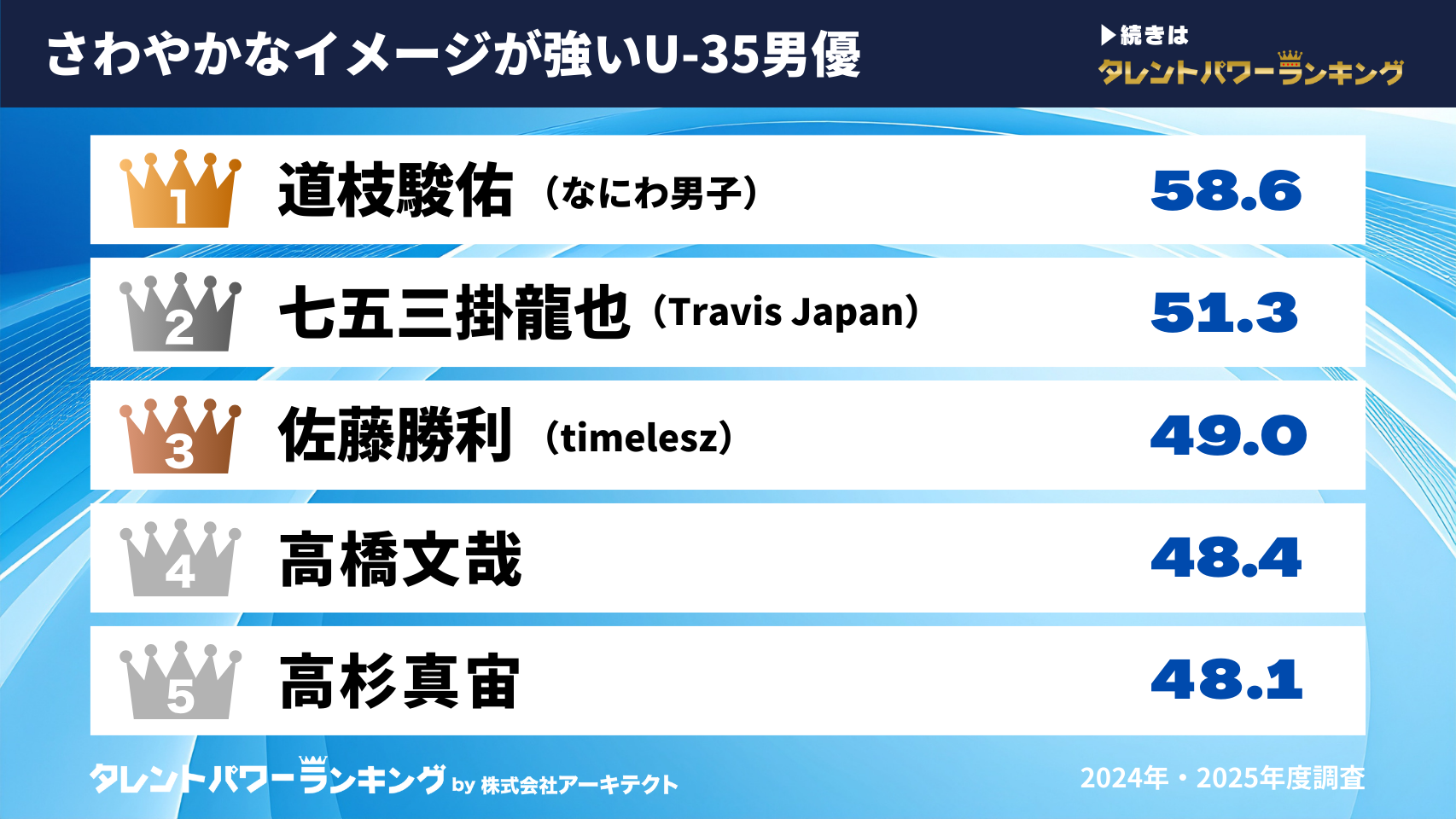 『タレントパワーランキング』では、タレントパワーランキングに登録されている、「さわやかな」イメージを持たれている35歳以下の男優のイメージスコアを調査。