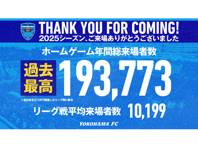 横浜FCでは、2025年11月30日(日)に行われました2025明治安田J1リーグ 第37節 京都サンガF.C.戦をもちまして、2025シーズンのリーグ戦ホームゲーム年間入場者数が193,773人となり、ホームゲーム全試合をニッパツ三ツ沢球技場で開催したシーズンにおける過去最多入場者数を記録した2023シーズンの155,184人を上回り、年間累計最多入場者数を更新いたしました。