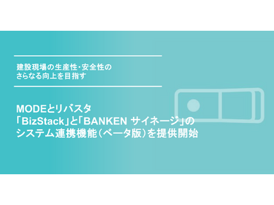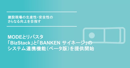 現場データの活用を支援するシリコンバレー発スタートアップMODE, Inc.(本社:米国カリフォルニア州、日本支店:東京都千代田区、CEO:上田 学、以下、MODE)と株式会社リバスタ(本社:東京都江東区、代表取締役:高橋巧、以下 リバスタ)は、MODEが提供する「BizStack(ビズスタック)」(※1)と、リバスタが提供する建設現場ICT機器ソリューション「BANKEN(バンケン)」(※2)のデジタルサイネージ「BANKEN サイネージ」(※3)において、システム連携機能(以下 本機能)のベータ版を提供開始したことをお知らせします。本機能の活用により、建設現場内の映像や風速、振動等の環境に関連するデータをデジタルサイネージに表示させることが可能となり、建設現場の生産性・安全性のさらなる向上を目指します。