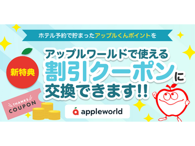 株式会社じげん(本社:東京都港区、代表取締役 社長執行役員CEO:平尾丈、東証プライム:3679、以下じげん)のグループ会社である株式会社アップルワールド(本店所在地:東京都新宿区、代表取締役社長:平尾 丈、以下APW)は、旅行会社向けホテル手配サイト「APPLE WORLD」において、ホテル予約で貯まる「アップルくんポイント」の交換特典として、割引クーポン「アップルクーポン」の提供を2025年7月1日より開始しております。