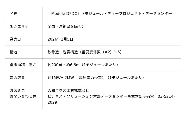 大和ハウス工業株式会社(本社:大阪市、社長:大友 浩嗣)は、創業以来培ってきた工業化建築技術を応用して開発した、モジュール(※1)型データセンター商品「Module DPDC(モジュール・ディープロジェクト・データセンター)」の販売を、2026年1月5日より開始します。