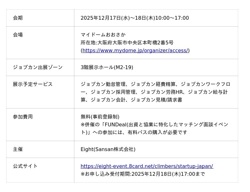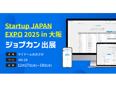 株式会社DONUTS(東京都渋谷区、代表取締役:西村啓成)が提供するバックオフィス支援クラウドERPシステム「ジョブカン」は、2025年12月17日(水)~18日(木)にマイドームおおさか(大阪府大阪市)で開催される日本最大級のスタートアップ向け展示会「Startup JAPAN EXPO 2025 in 大阪」に出展します。