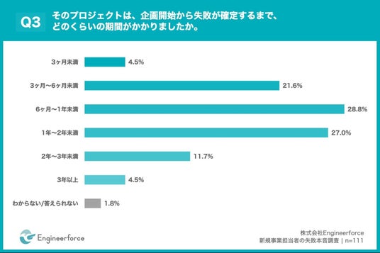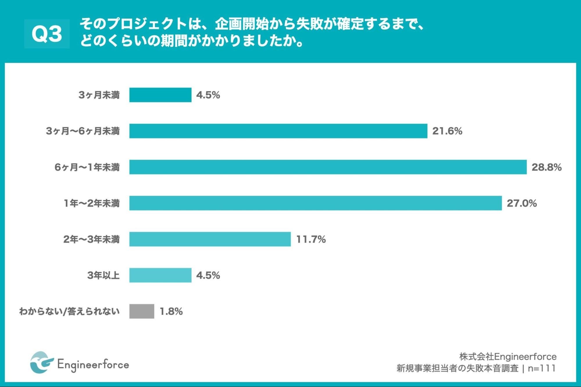 「Q3. そのプロジェクトは、企画開始から失敗が確定するまで、どのくらいの期間がかかりましたか。」(n=111)と質問したところ、「3ヶ月未満」が4.5%、「3ヶ月~6ヶ月未満」が21.6%という回答となりました。