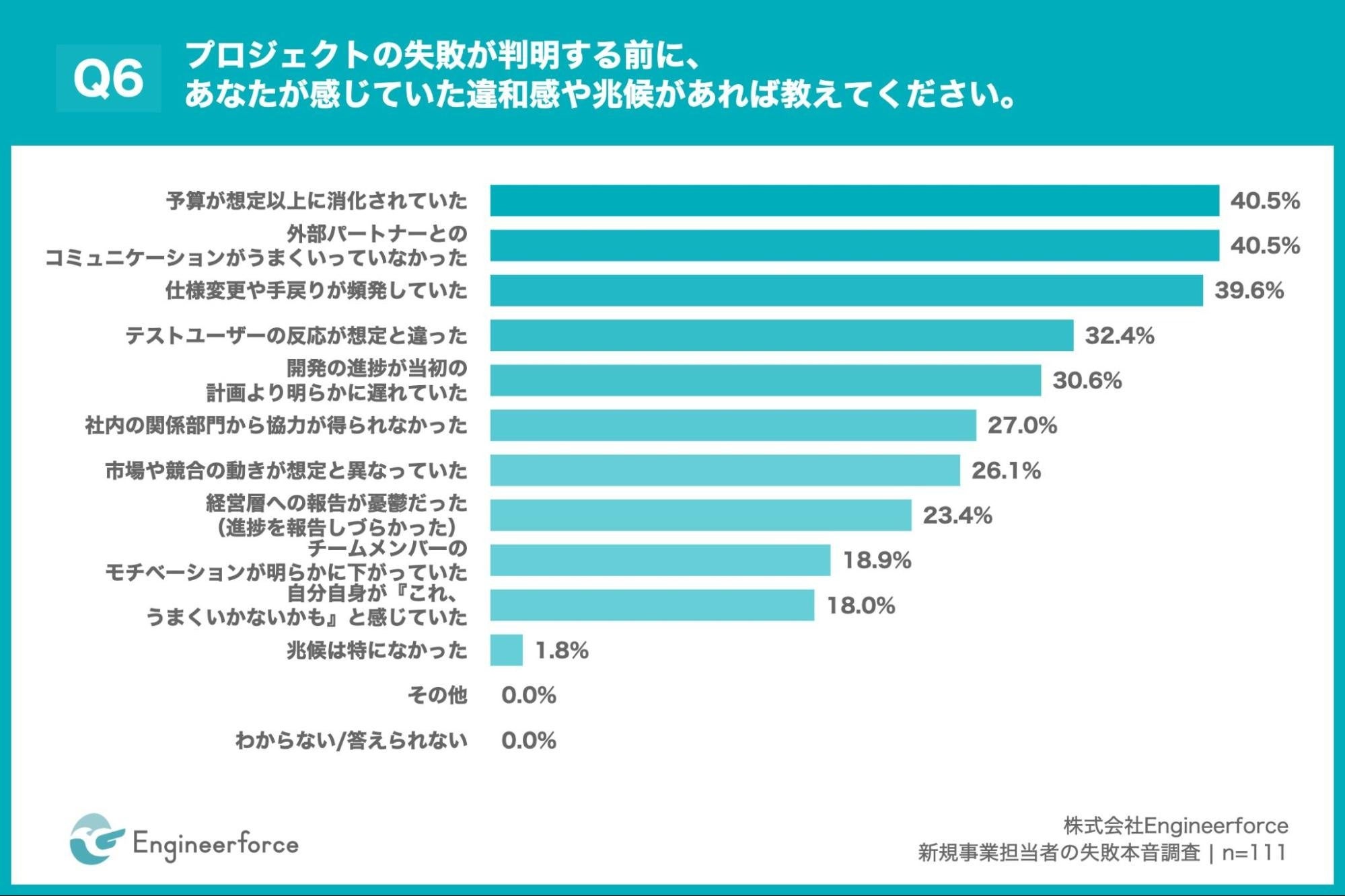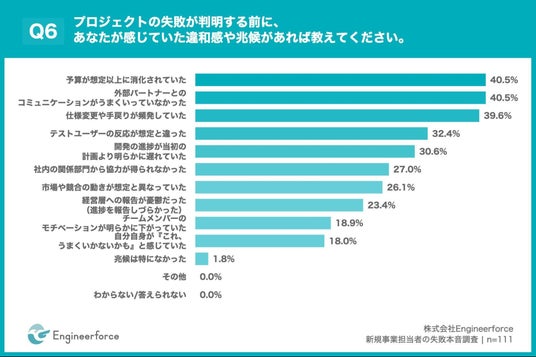 Q6. プロジェクトの失敗が判明する前に、あなたが感じていた違和感や兆候があれば教えてください。(複数回答)」(n=111)と質問したところ、