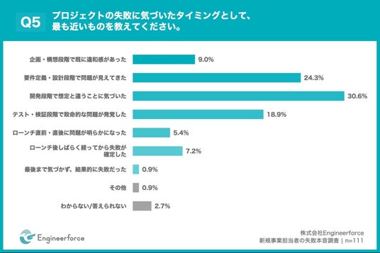Q5. プロジェクトの失敗に気づいたタイミングとして、最も近いものを教えてください。」(n=111)と質問したところ、