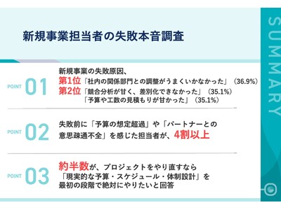 - 01|新規事業の失敗原因、第1位「社内の関係部門との調整がうまくいかなかった」(36.9%)第2位「競合分析が甘く、差別化できなかった」(35.1%)「予算や工数の見積もりが甘かった」(35.1%)