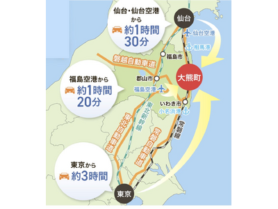 大熊町は仙台まで車で約1時間30分、東京まで車で約3時間。常磐自動車道大熊ICや福島空港・仙台空港などへのアクセスも良好です。