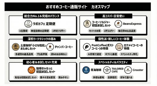本カオスマップでは、ラボカフェ定期便をはじめとする11のサービスを、「総合力」「高コスパ」「スペシャルティ」「お試しセット」など6つのカテゴリに分類。自分のライフスタイルや好みに合った通販サービスを、直感的に探せる内容となっています。