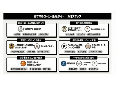 株式会社オークス(本社:東京都目黒区、代表取締役:柏倉 元太)が運営するコーヒー情報サイト「コーヒー豆研究所」は、国内の主要なコーヒー通販・サブスクリプションサービスを特徴別に整理した「おすすめコーヒー通販サイト カオスマップ」を公開しました。