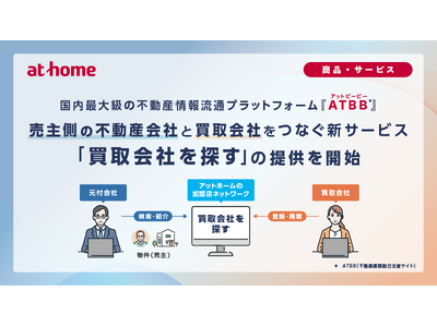 不動産情報サービスのアットホーム株式会社(本社:東京都大田区 代表取締役社長:鶴森 康史 以下、アットホーム)は、不動産情報流通プラットフォーム「ATBB(不動産業務総合支援サイト)」(以下、ATBB)において、新サービス「買取会社を探す」の提供を開始いたしました。本サービスにより、売主側の不動産会社(以下、元付会社)と買取事業を行っている不動産会社(以下、買取会社)の早期マッチングを図り、売買物件の流通活性化を促進してまいります。