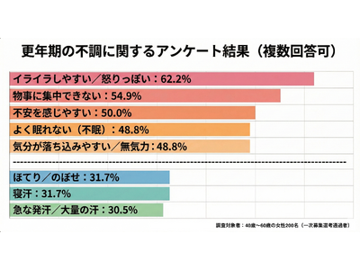 aiwell株式会社(本社:東京都千代田区、代表取締役:馬渕浩幸)は、この度、40歳~60歳の女性200人に対し、更年期の不調に関するアンケートを実施しました。 これは、2026年春に予定している「更年期障害検査キット」の発売に先立ち実施したプレモニターに応募頂いた方々より、モニター一次選考通過者200名の集計によるものです。