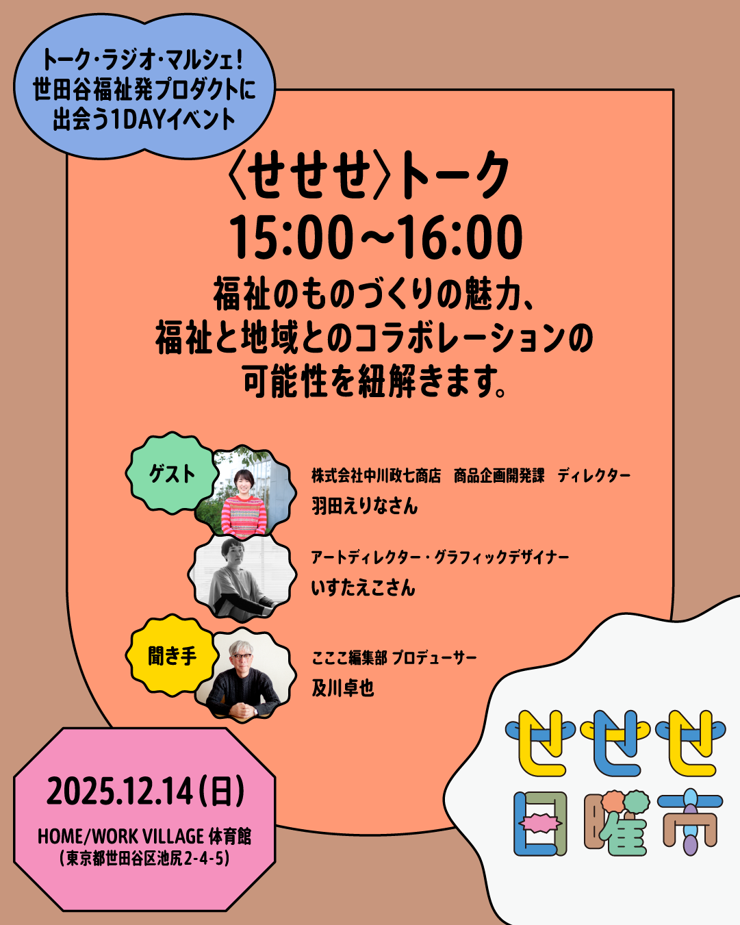 株式会社マガジンハウス(以下マガジンハウス、本社:東京都中央区、代表取締役社長:鉄尾周一)は、2025年12月14日に開催される「せせせ日曜市~トーク・ラジオ・マルシェ!世田谷福祉発プロダクトに出会う1DAYイベント~」(以下、「せせせ日曜市」)の企画・運営を担当しています。