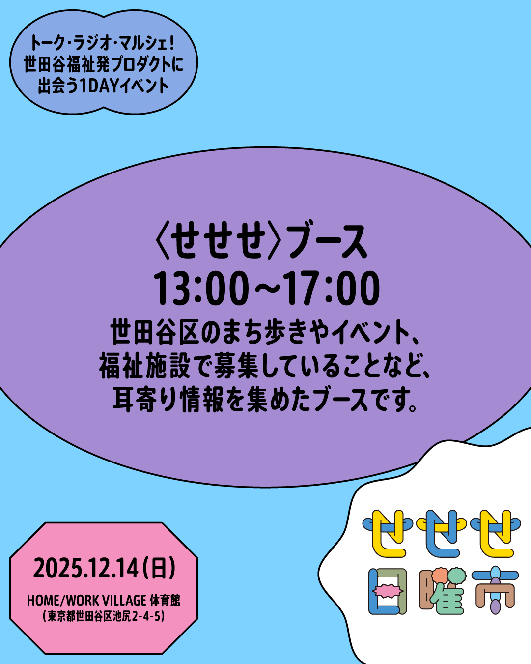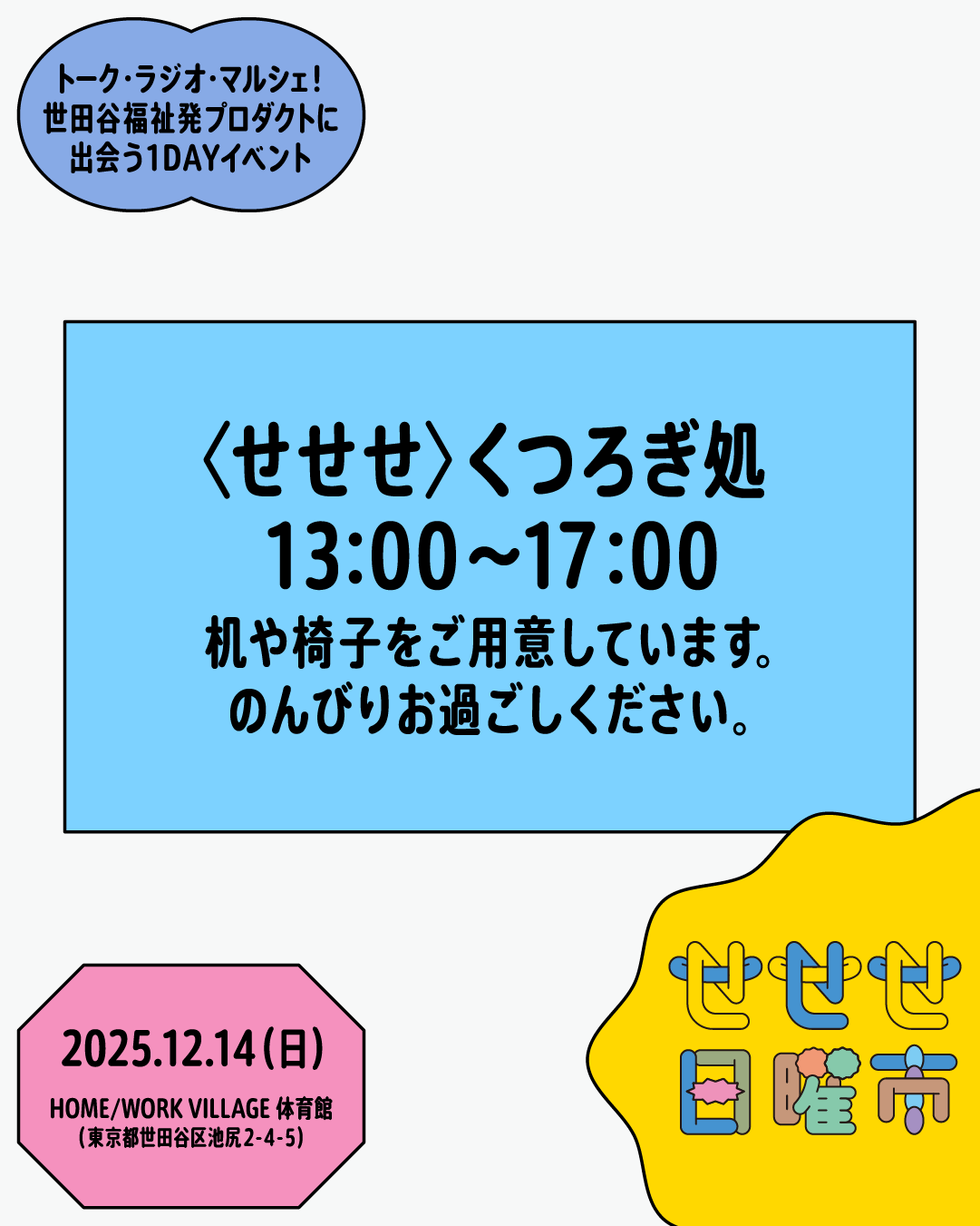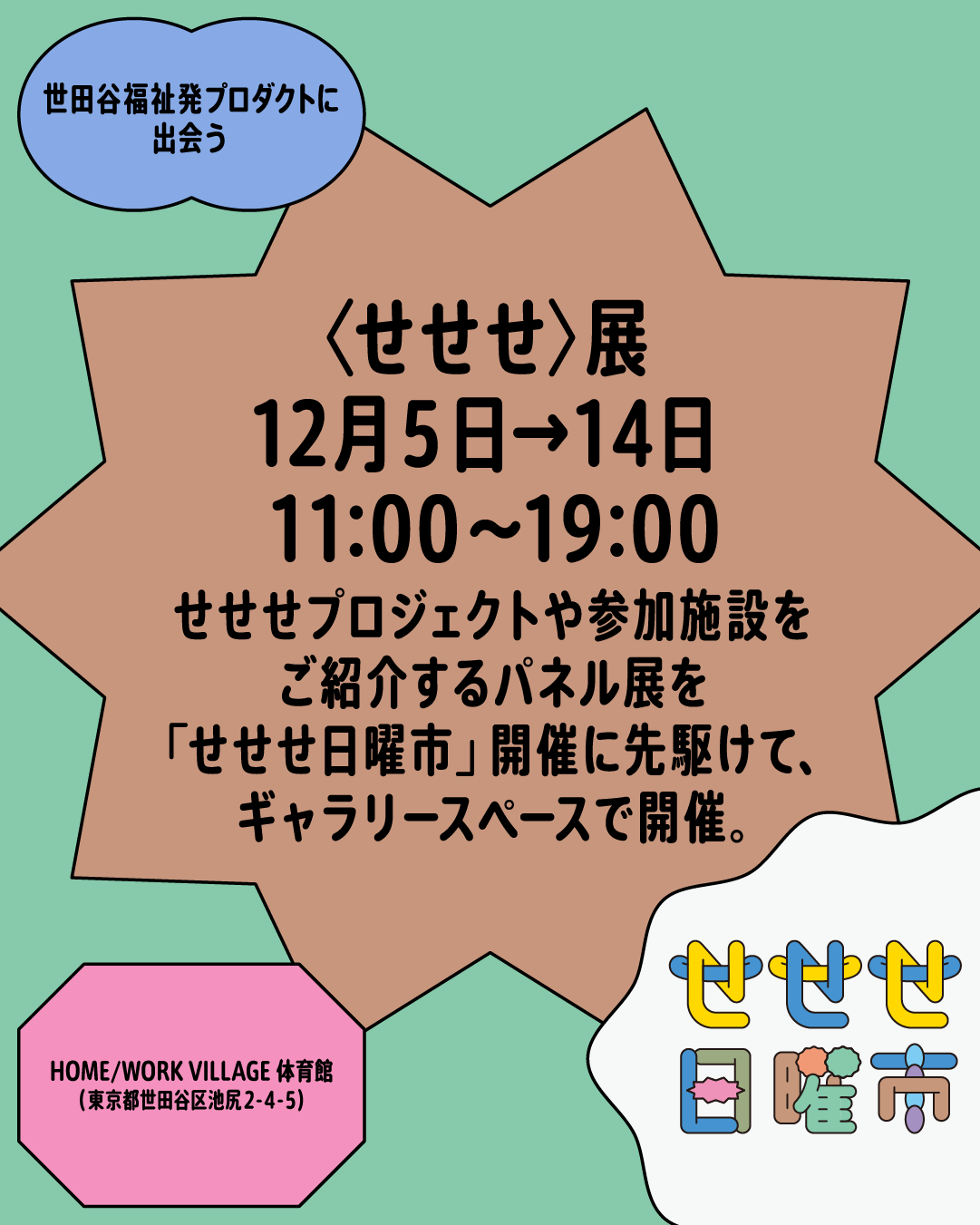 また「せせせ日曜市」に先駆け、12月5日よりイベント会場であるHOME/WORK VILLAGE内にてプロジェクトをご紹介するパネル展「〈せせせ〉展」も開催します。合わせてお楽しみください。