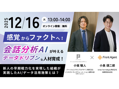 組織を変革するインサイトアナリシス(TM)「Front Agent」を開発・提供するUmee Technologies株式会社(本社:東京都調布市、代表取締役:新納 弘崇、以下「ユミー」)は、営業生産性向上支援に定評のあるパーソルビジネスプロセスデザイン株式会社(本社:東京都港区、代表取締役社長:市村 和幸、以下「パーソルビジネスプロセスデザイン」)と、12月16日(火)13:00 - 14:00に無料オンラインセミナー「感覚からファクトへ!会話分析AIが叶えるデータドリブンな人材育成!新人の早期戦力化を実現した組織が実践したAI/データ活用施策とは?」を開催いたします。
