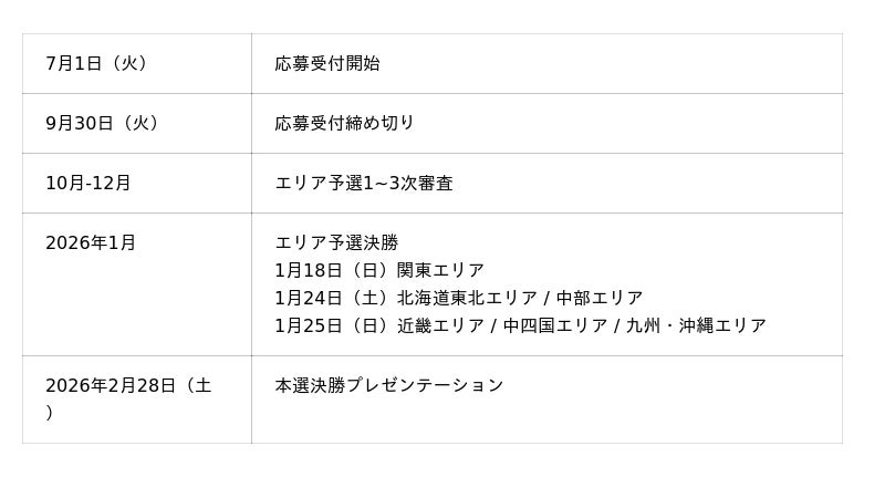 2025年度大会では、2025年7月1日(火)~9月30日(火)の応募期間において、昨年を上回る11,554件の応募が全国から寄せられました。現在は、エリア予選1~4次審査を進めており、各エリアを代表するファイナリストを選出し、2026年2月28日(土)に東京・渋谷ヒカリエにて本選決勝を開催いたします。