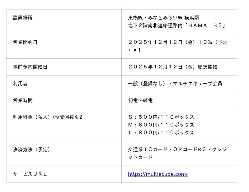 ロッカースペースには、株式会社JR東日本スマートロジスティクスが開発した次世代の多機能ロッカー「マルチエキューブ」を導入します。S・M・Lサイズ合わせて330ボックスのロッカーを設置し、お客さまの手荷物預入ニーズに対応します。通常の預入利用はもちろん、「マルチエキューブWEBサイト」からの空き検索・事前予約も可能です。12月12日(金)10時から通常の預入を開始し、同日から事前予約も可能です。