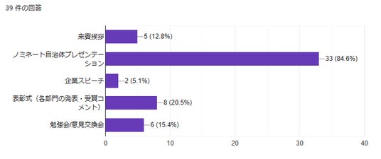 最多が「ノミネート自治体プレゼンテーション」(33自治体) となり、今回のイベントの核となる“自治体の取り組み紹介”が強く評価された結果となりました。