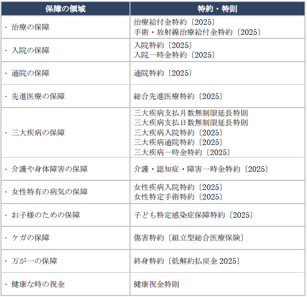 *本商品は、「組立型総合医療保険〔2025〕普通保険約款」に契約全体に共通する事項(契約の責任開始、契約取消・無効・解除など)を、「各特約」に保障内容および特約固有の事項(特約の保険期間、特約給付金の支払事由など)を定め、特約を1つ以上付加した場合に成立する仕組みです。なお、所定の条件により、単独では付加できない特約や組み合わせがあります。