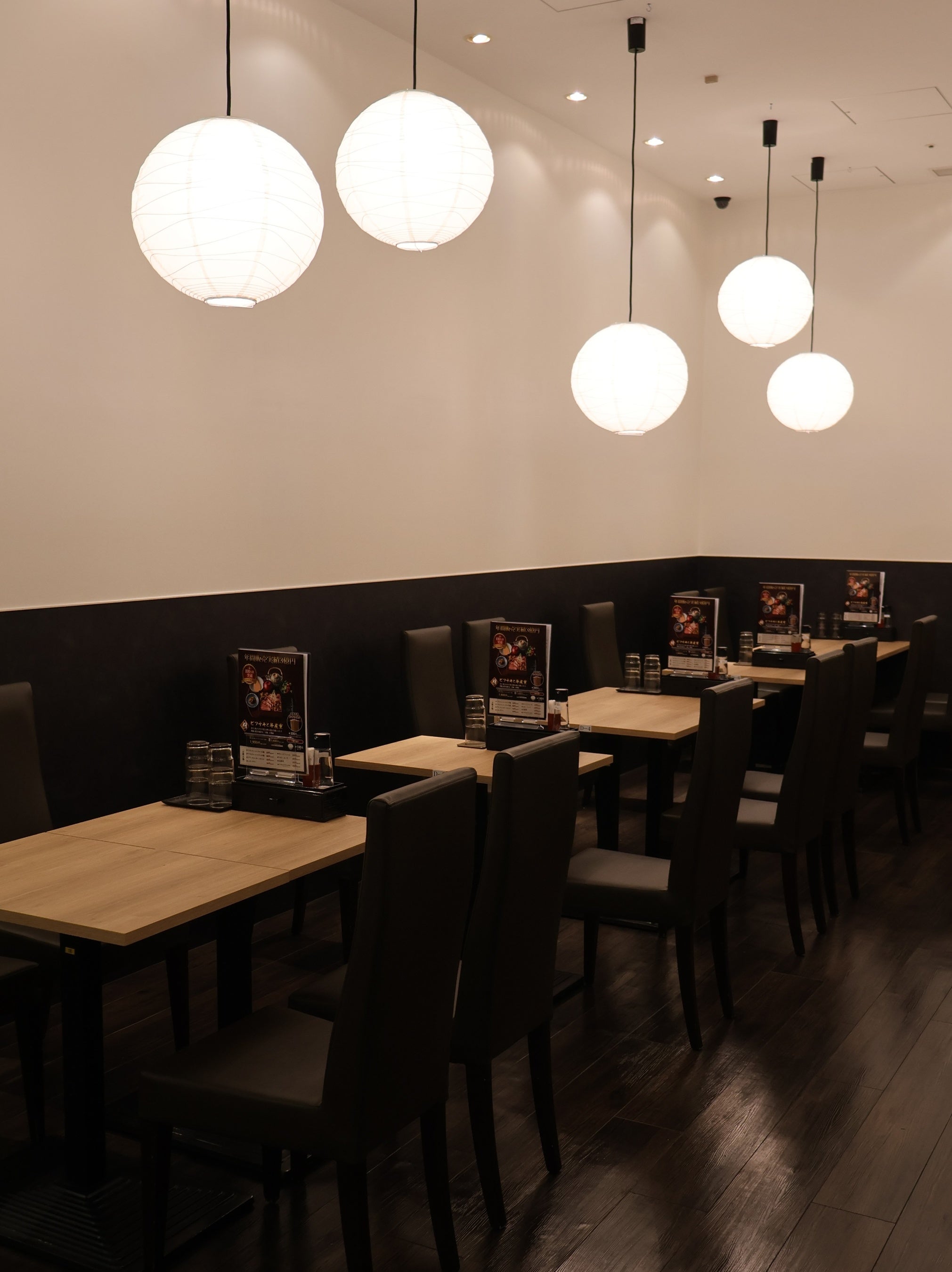 ビフテキ牛ノ福では、木製格子と暖簾(のれん)が目に入った瞬間から、どこかほっとする“和”の空気に包まれます。一歩足を踏み入れると、白い壁とやわらかな間接照明が織りなす、落ち着いた大人の雰囲気。昔ながらの趣きはそのままに、現代的でスタイリッシュな空間に仕上げました。天井も高く、席の間隔にもゆとりがあるので、周りを気にせずゆっくりお食事を楽しんでいただけます。お仕事帰りのごほうびのビフテキ、記念日のディナーなど、ちょっとぜいたくしたい気分の日の外食にもぴったり。「今日はゆっくり、おいしいお肉と自分の時間を楽しみたい」、そんな日には、ぜひビフテキ牛ノ福の開放感あふれる空間で、特別なひとときをお過ごしください。