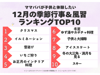 発表!子供と体験したい「12月の季節行事&風習ランキング」2位「イルミネーション」1位は?「年賀状づくり」は11位/いこーよファミリーラボ調査2025【冬休み・冬レジャー調査リリース第3弾】