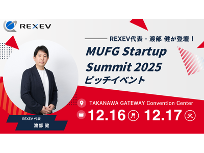 株式会社REXEV(本社:東京都千代田区、代表:渡部 健、以下 REXEV)は、2025年12月16日(月)および17日(火)に開催される「MUFG Startup Summit 2025」内のピッチイベントに登壇することをお知らせいたします。