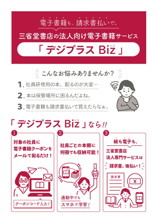 無料お試しクーポンコードの配布を開始します。三省堂書店は2025年10月から、国内最大級の総合電子書籍ストア「ブックライブ」と協業のうえ、電子書籍を請求書払いで一括購入できるサービス「デジプラスBiz」を開始しました。「導入前にまずは一度試してみたい」「使い勝手を知りたい」というお声に応えるため、お問合せ頂いた企業様に無料お試しクーポンコードを配布いたします。