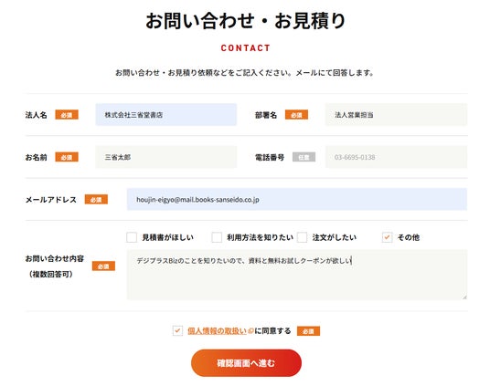 2.必須項目を入力のうえ、「お問い合わせ内容」欄にデジプラスBizについて問い合わせしていることを記載ください。