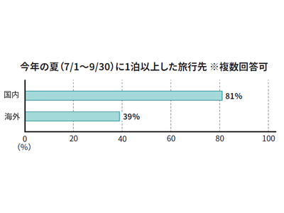 今年の夏に国内旅行をされたかたは81% 、海外旅行は39%に。海外の渡航先はヨーロッパ、北米、ハワイが減少した一方、アジア圏が昨年の32%から39%へ増加し、近距離の渡航先が増加傾向に。