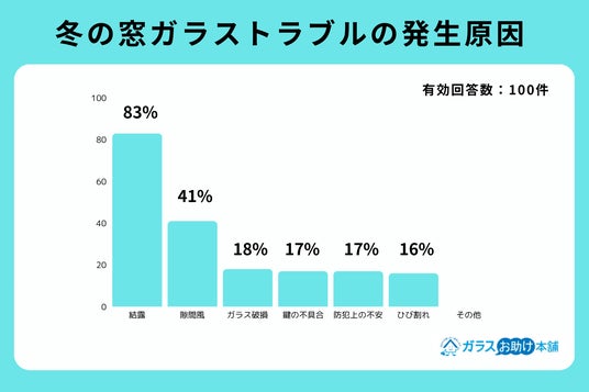 また、冬場の窓ガラストラブルとしては「結露」が83%で最多の回答でした。次に、「隙間風」のトラブルが41%となっています。