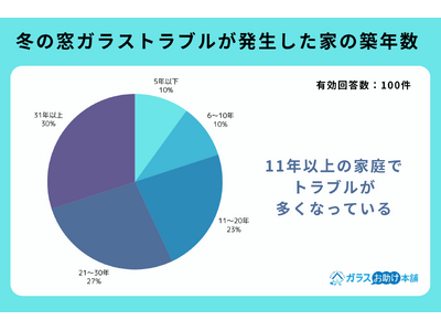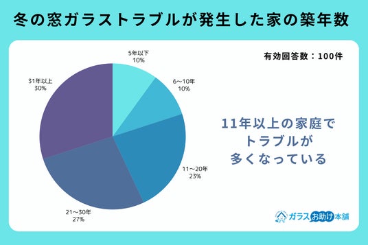 冬の窓ガラストラブルを経験したことがあると回答した人が住む住居の築年数を聞いたところ、「5年以下」「6~10年」は10%、「11~20年」が23%、「21~30年」が27%、「31年以上」が30%という回答が得られました。