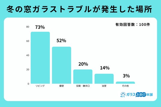 次に、冬の窓ガラストラブルが発生した場所について聞いたところ、「リビング」が73%で最多となり、次に「寝室」52%、「玄関・勝手口」20%と続きました。