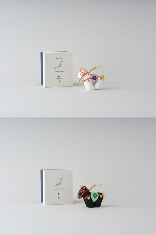 コロコロという心地よい音色が特長の土鈴。魔除けや縁起物として知られる土鈴は、お守りのような存在として、長い間親しまれてきました。京都のシンボルカラーである紫色の胴掛けをまとった白馬と、スターバックスのブランドカラーである緑色の胴掛けをまとった黒馬が、新年の訪れを華やかに彩ります。和やかに音色を奏でるぷっくりとしたフォルムの福午を、新年の始まりに飾ってみてはいかがでしょうか。