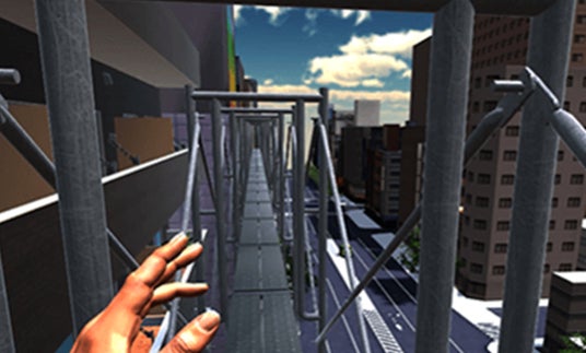 足場での災害をVRで疑似体験し、安全意識を向上。実物の足場機材を併用することでリアルな体感ができる。また、狭いスペースで簡単導入可能。 [(株) 杉孝]