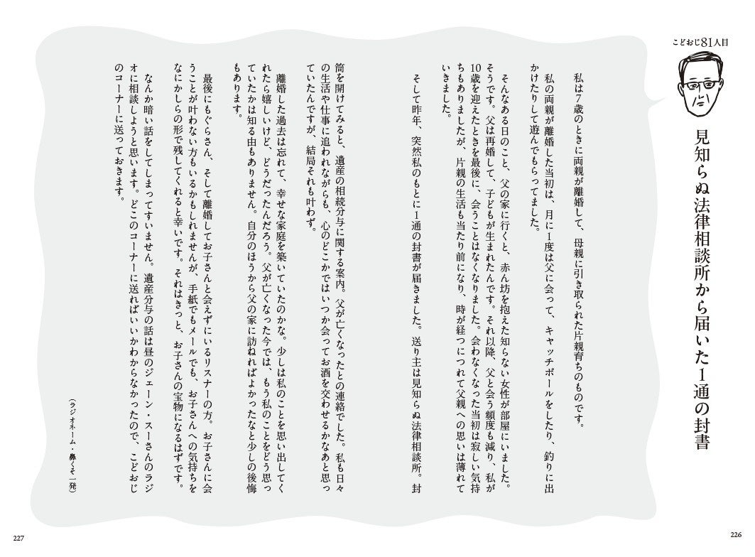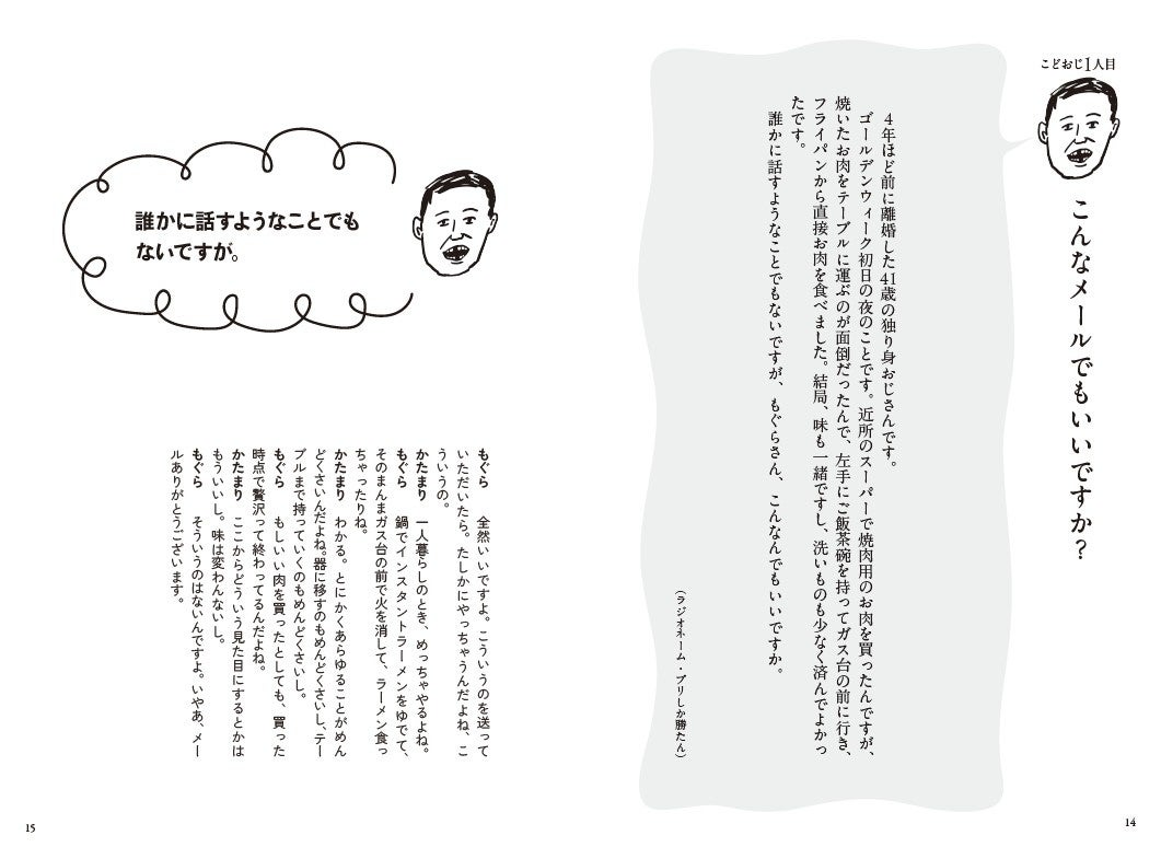 不意に感じる寂しさ、家や会社での居心地の悪さ、時折感じるささやかな幸せ……孤独なラジオリスナー達の想いを、お笑いコンビ「空気階段」の鈴木もぐらさんと水川かたまりさんが受け止め、語り合う。これまでに集まったメールを厳選し、空気階段の2人のリアクションとともに掲載した書籍です。