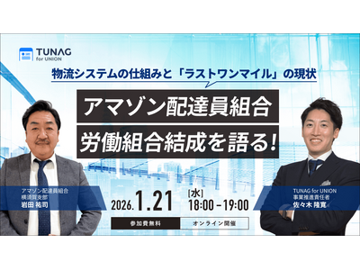 株式会社スタメン(東京本社:東京都千代田区、代表取締役:大西 泰平、以下 当社)が開発・提供する「TUNAG for UNION(ツナグ フォー ユニオン、https://biz.tunag.jp/lp/union)」は、アマゾン配達員組合/横須賀支部、岩田祐司氏と、2026/01/21(水)18:00~19:00に参加無料のオンラインセミナーを開催いたします。