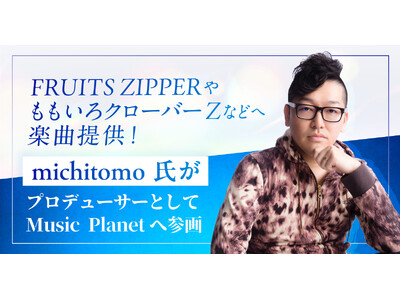 https://music-planet.jp/ )に、michitomo氏がプロデューサーとして参画することが決定しました。michitomo氏は、FRUITS ZIPPERやももいろクローバーZなどのアイドルから、SPYAIRやV6などのアーティスト、にじさんじなどのVTuberまで、多方面で楽曲を提供。また、近年ではアニメやドラマといった映像作品の音楽も手掛けるなど、多方面で活躍されています。そんなmichitomo氏が、このたびミュージックプラネットに参画。次世代のアーティストをプロデュースします。