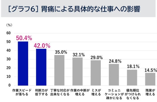 具体的には「作業スピードが落ちる」(50.4%)、「判断力が低下する」(42.0%)などを引き起こしています[グラフ6]。