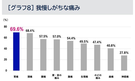 これほど深刻な影響があるにも関わらず、胃痛は「我慢しがちな痛み」の中で最も多く回答(69.6%)され、多くの人が痛みを“放置”していることが明らかになりました[グラフ8]。