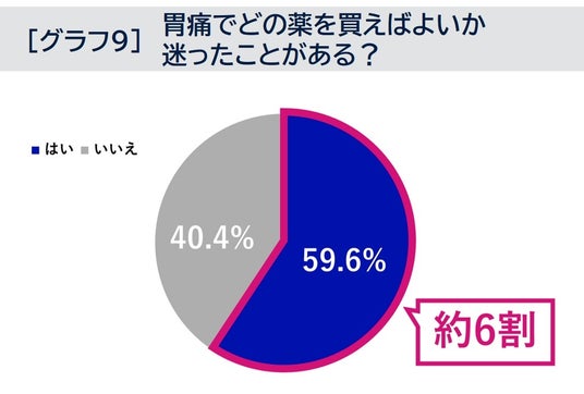 胃痛を市販薬で対処しようとしても、約6割(59.6%)が「どの薬を買えばよいか迷った経験がある」と回答[グラフ9]。「種類が多すぎて選べない」などの理由から、多くが適切な対処法が分からない“胃痛ケア迷子”状態に陥っているというジレンマが浮き彫りになりました。