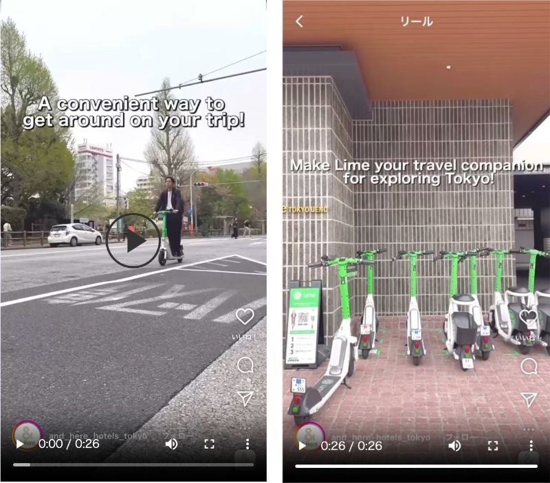 ▲&Here TOKYO公式のInstagram(Limeの乗り方に関するリールを投稿したところ好調に再生されている)