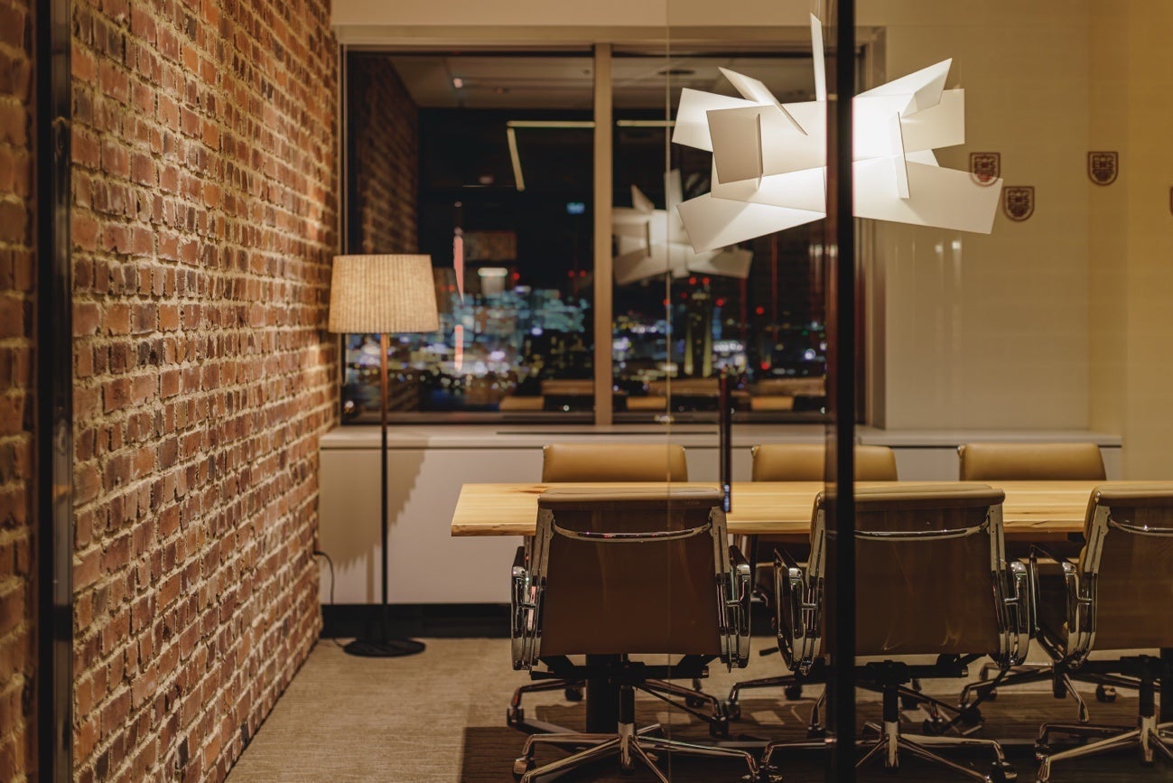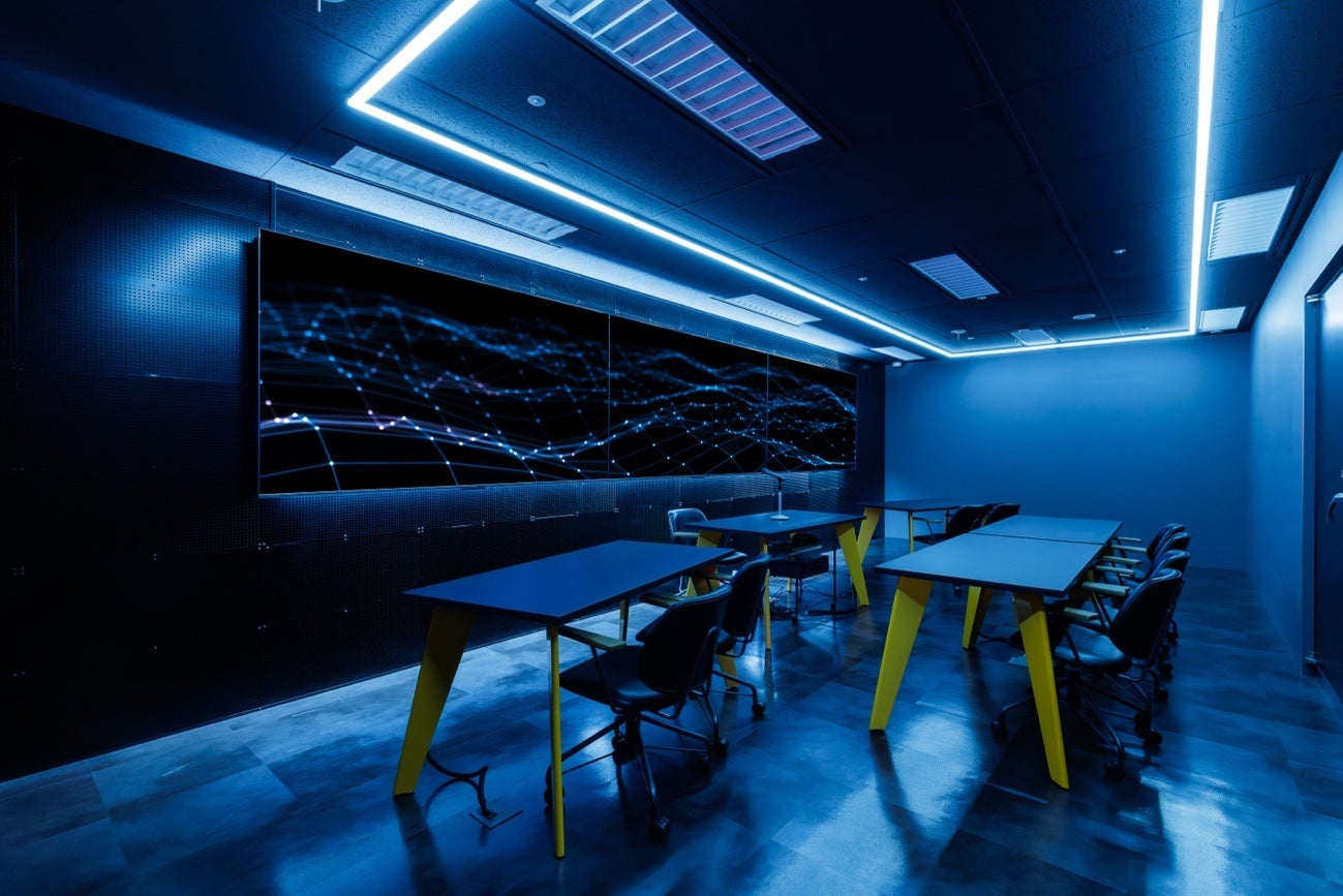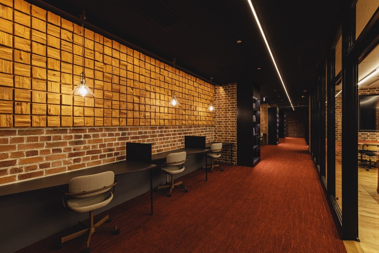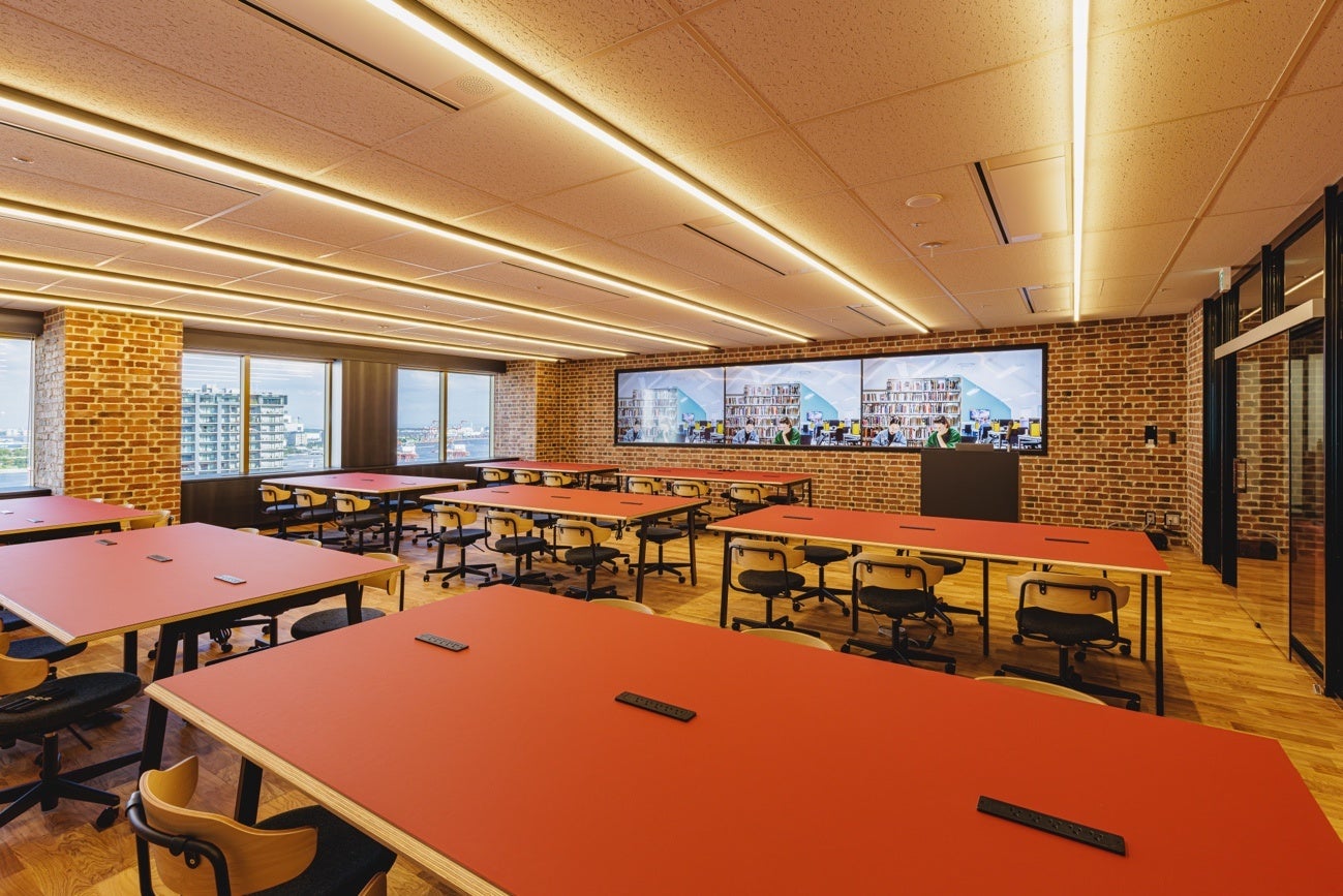 品川区天王洲のキャンパスは約500平方メートル で、2つの教室、ノックソックルーム、ラボルーム、自習室、面談室、そしてそれらをつなぐ廊下の自習スペースなどで構成されています。赤いロゴのイメージを空間にも反映させ、西洋の象徴である煉瓦と、日本の象徴である木材や竹をメイン素材として用いています。窓から広がる東京湾と美しいビル群を借景として取り入れるため、窓面に対して可能な限り開放的なレイアウトとしています。各教室には 100インチディスプレイを6台設置し、必要に応じてダイナミックな映像によって授業にメリハリをつける工夫を施しています。また、ノックソックルームとラボルームは、将来的なハッカーへの対策を学ぶユニークなカリキュラムを想定した空間となっています。ノックソックルームは主にハッカーの侵入を防ぐ防衛組織をイメージし、ラボルームはハッカー集団のアジトをイメージしたデザインで、古いゲームセンターのゲームを配置しています。授業で使用していない時間には、学生の気分転換として自由に遊ぶことができます。
