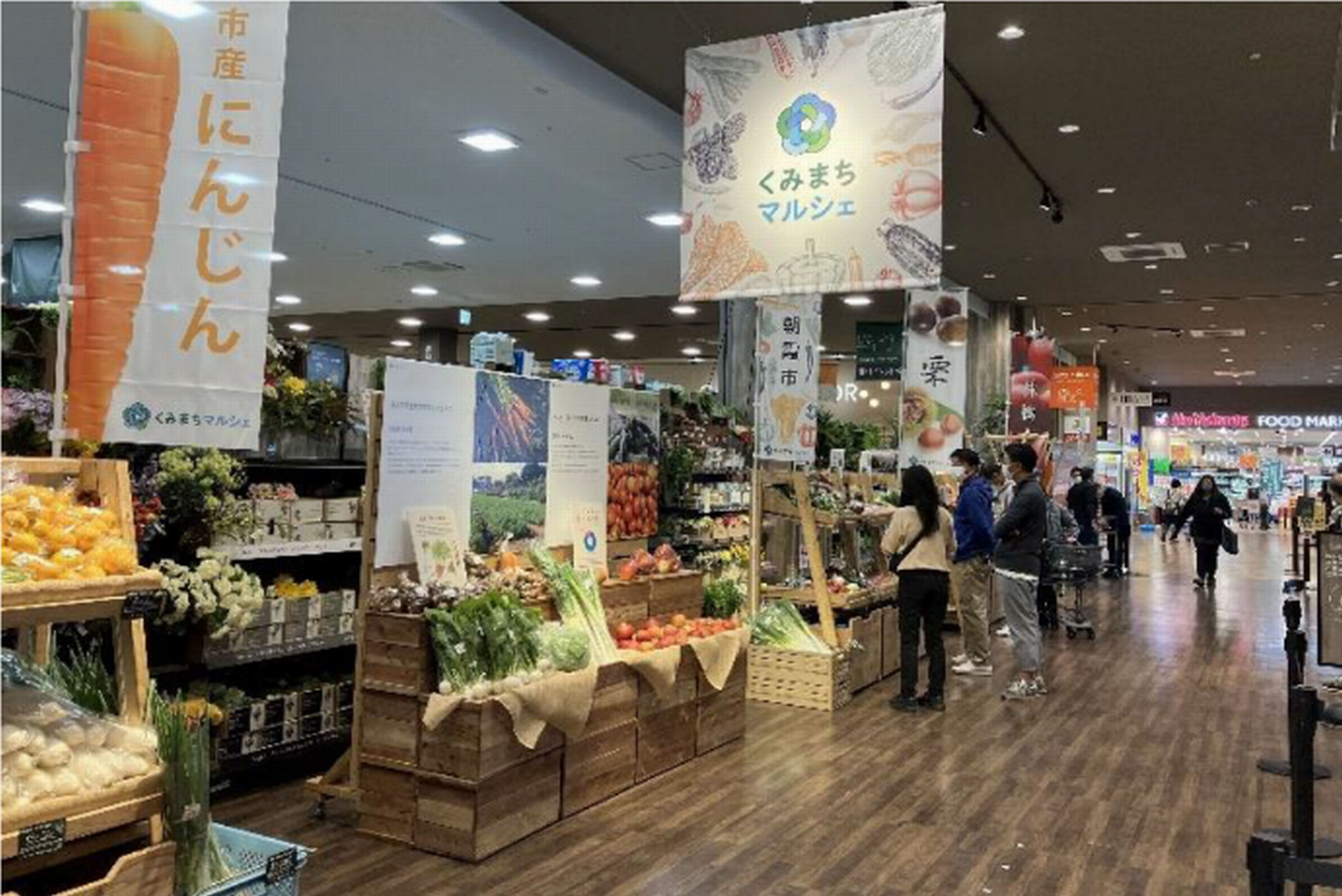 地元の農業生産者が育てた新鮮な採れたて野菜を販売するマーケットとして、地元産野菜、地元産玄米や、味に違いはないものの通常では商品になりにくい「規格外」野菜など、多彩な商品を取り揃えた「くみまちマルシェ」を常設します。