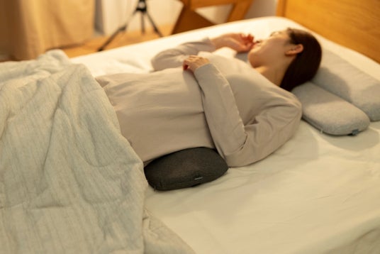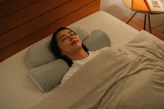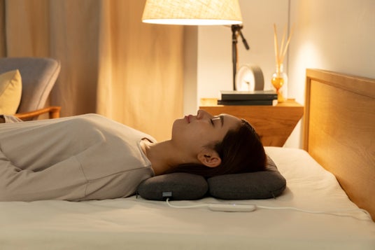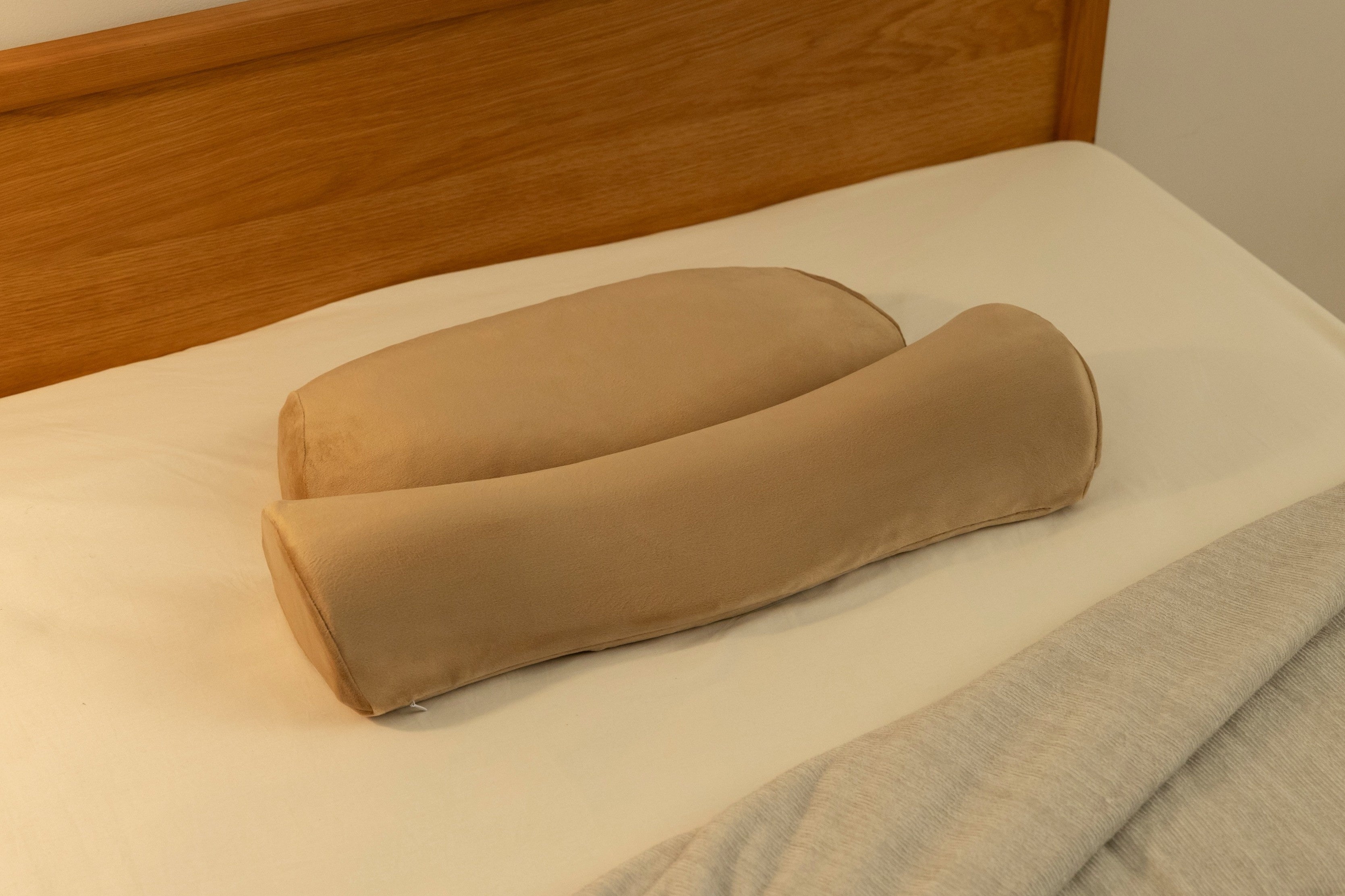横向き寝の姿勢に沿う立体構造で、首・肩を自然に温めながら支える枕。横向きが楽な人のために生まれたモデル。