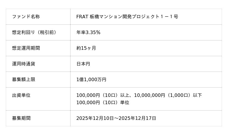 「未来をわかちあう投資」を提供する「Funvest(ファンベスト)」(以下、Funvest)は、「FRAT 板橋マンション開発プロジェクト1-1号」(以下、本ファンド)の募集を12/10より開始しますので、お知らせいたします。