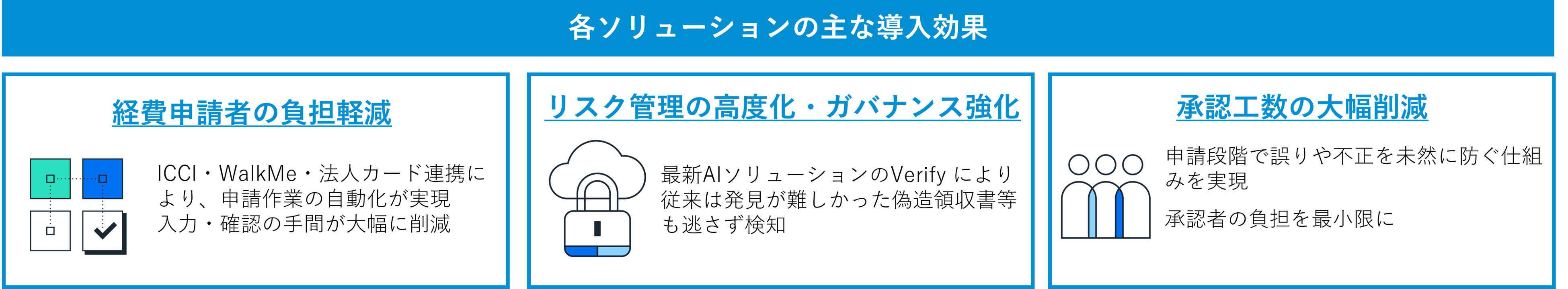 こうした取り組みの一環として、AI不正検知ソリューション「Verify」、交通系ICカードとの自動連携を実現する「ICCI(IC Card Integration)」、デジタルアダプション・プラットフォーム「WalkMe Premium for SAP Concur Solutions」を採用しました。